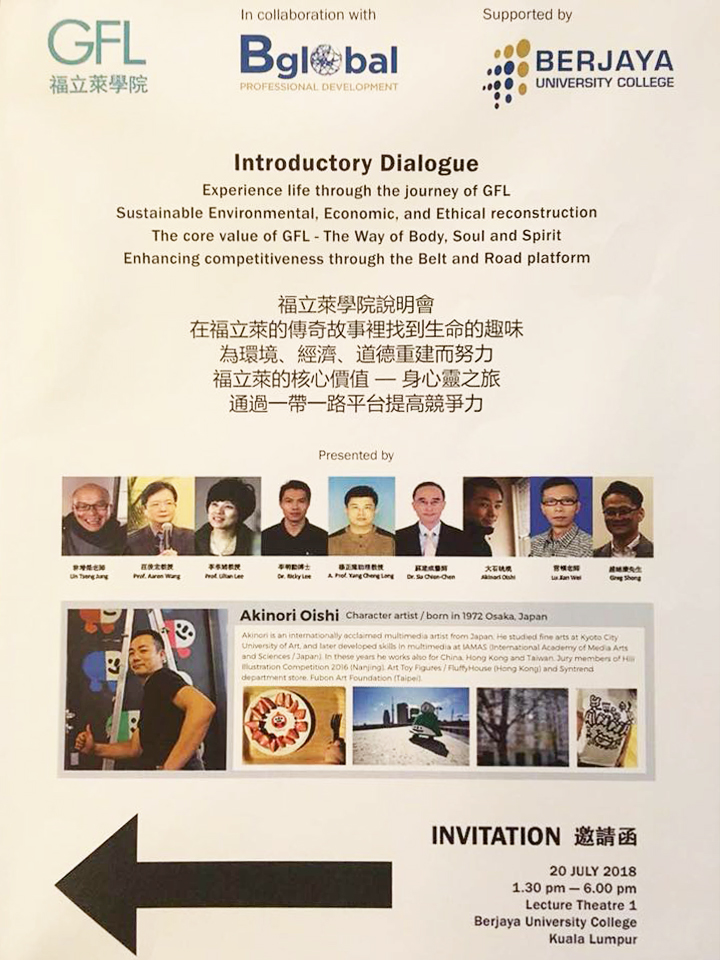 July 20th 2018, Aki lecture introduction of the new course for GFL (Great Free Light) 福立莱 @ Berjaya University College in KL, Malaysia - マレーシア、ベルジャヤ大学で新設されるGFL主催の授業の講師陣/紹介にて、講演して来ました。2018.07.20